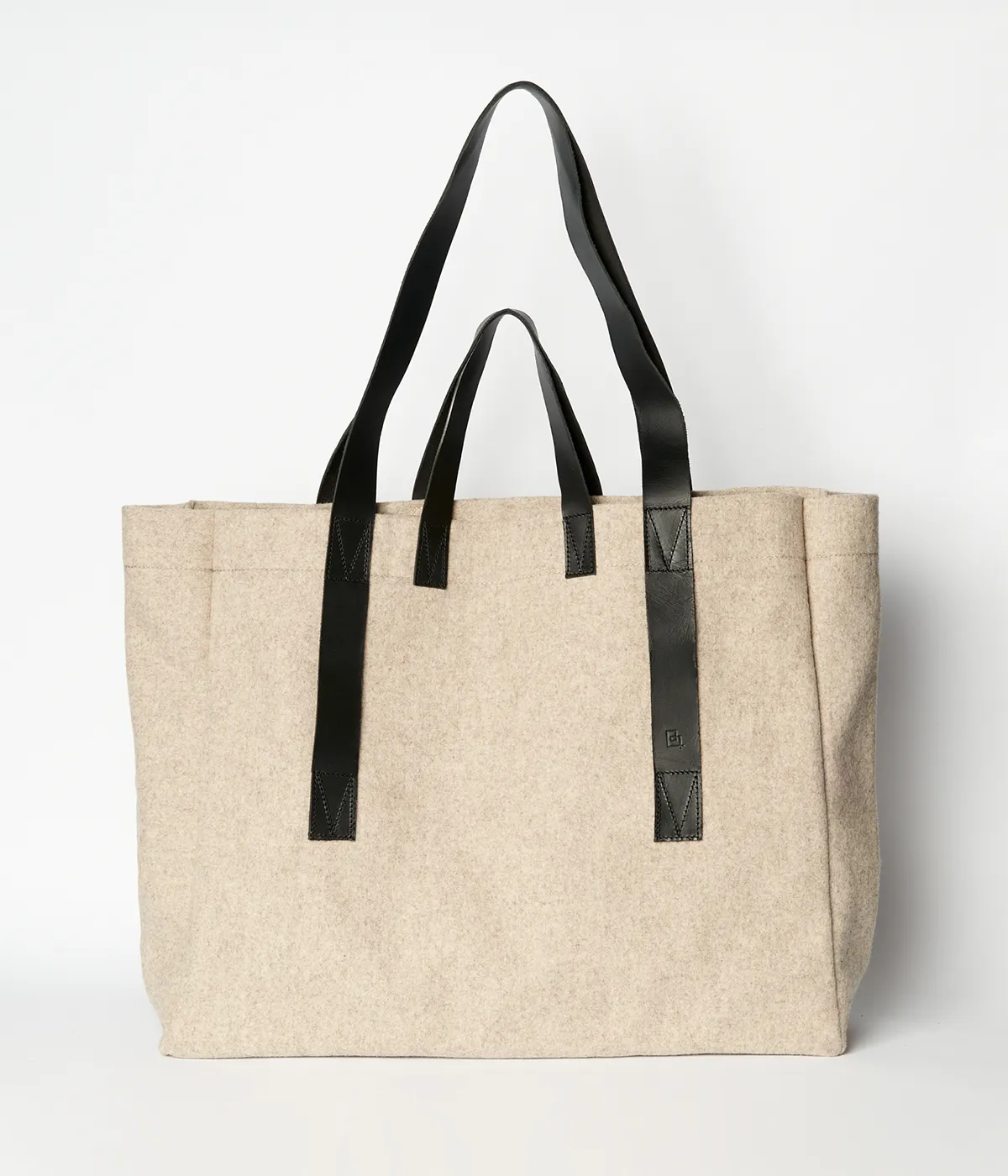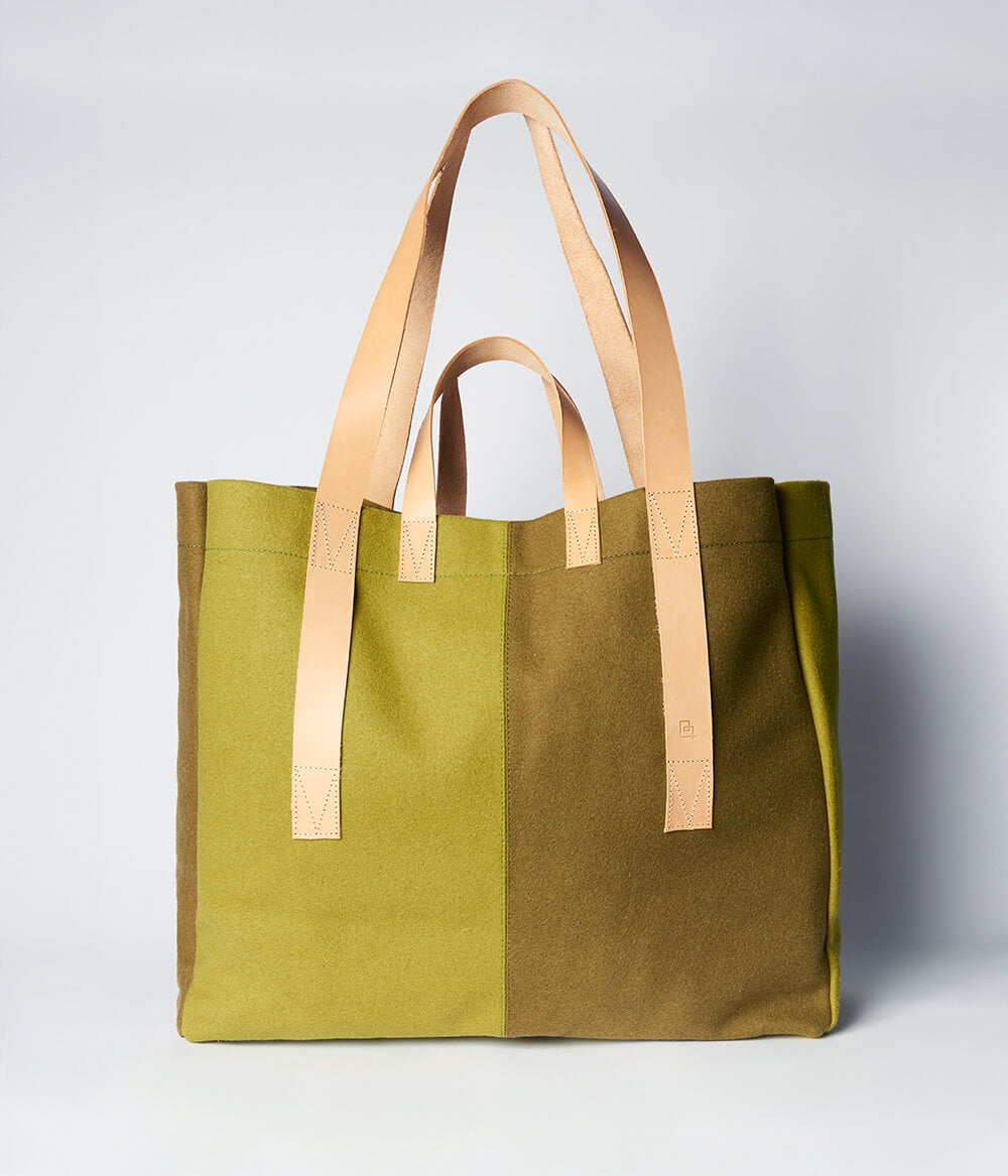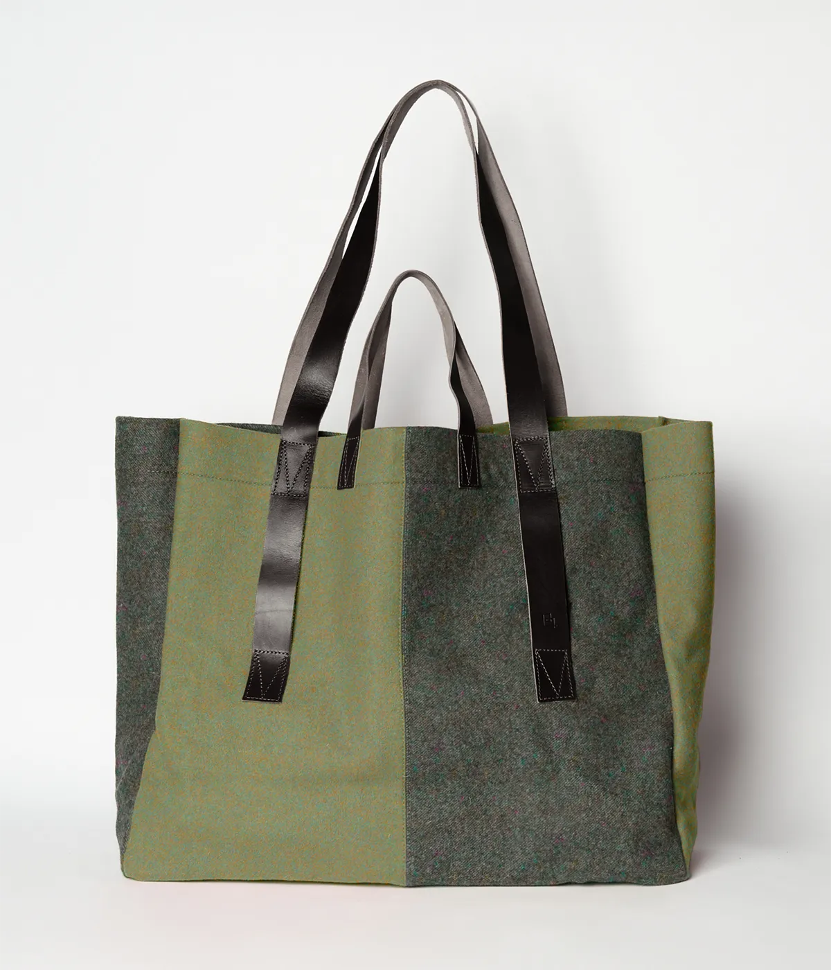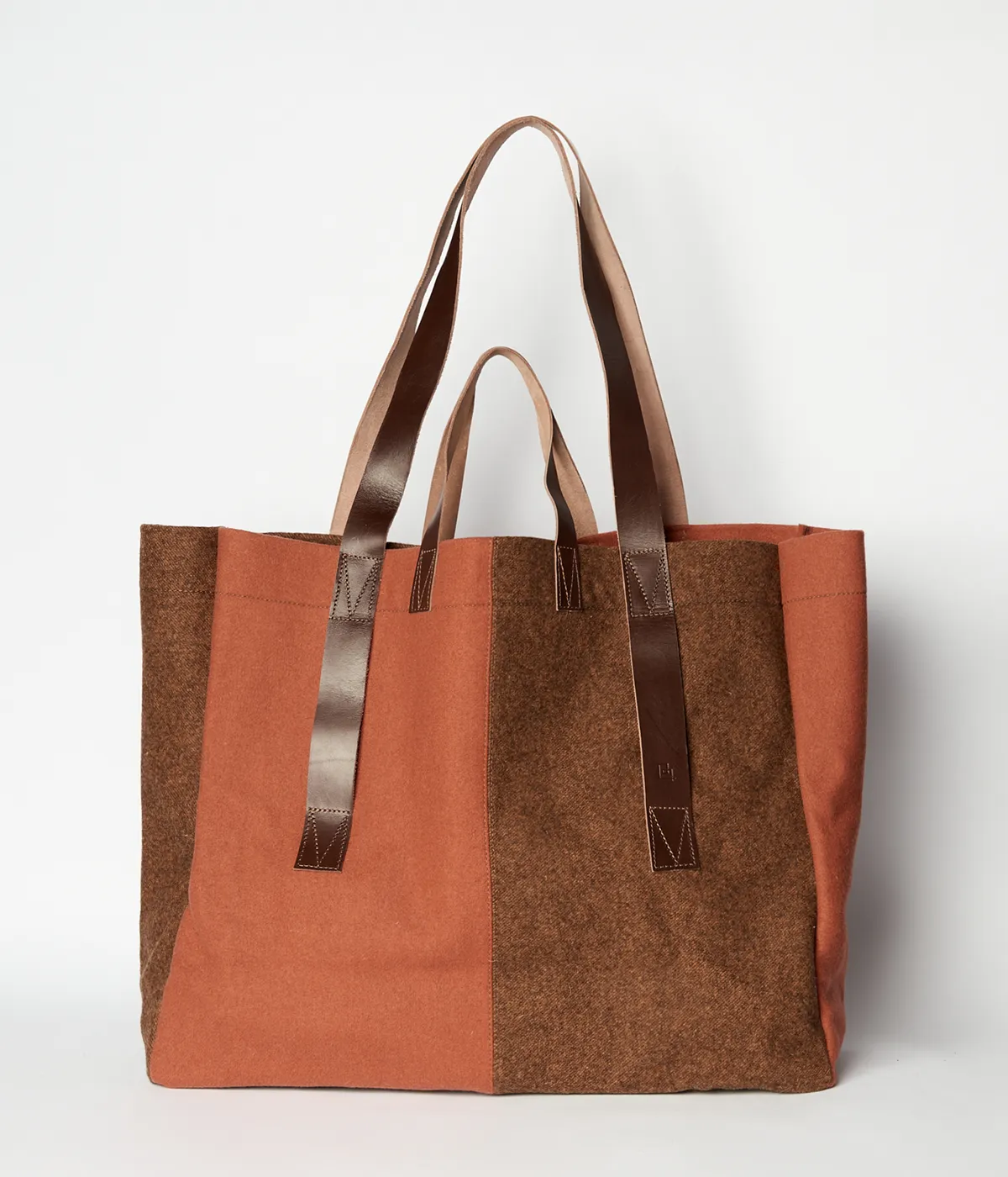 Tote bag duplo padrão em burel 600gr e 450gr. Alças em pele genuína.
