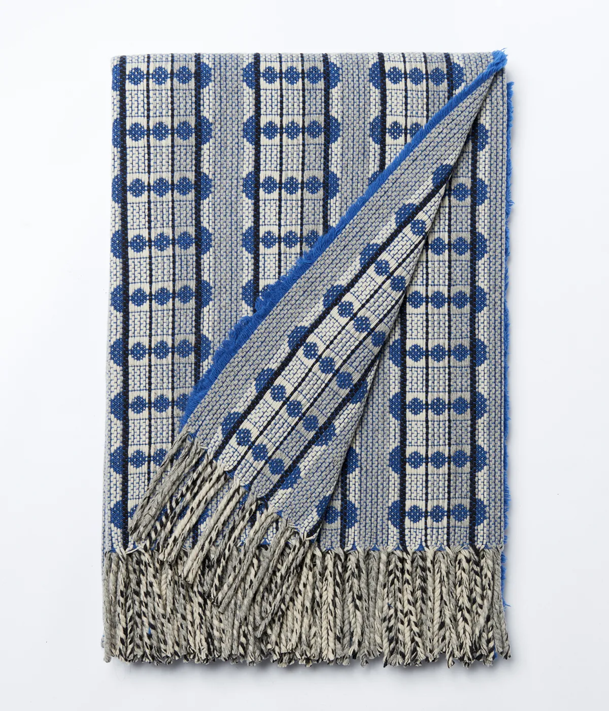 A Manta Déco Burel Factory é feita a partir das melhores fibras de lã merino, em teares ancestrais e acabada à mão. Com um padrão revivalista Art Déco, está disponível nas cores azul, framboesa e castanho.