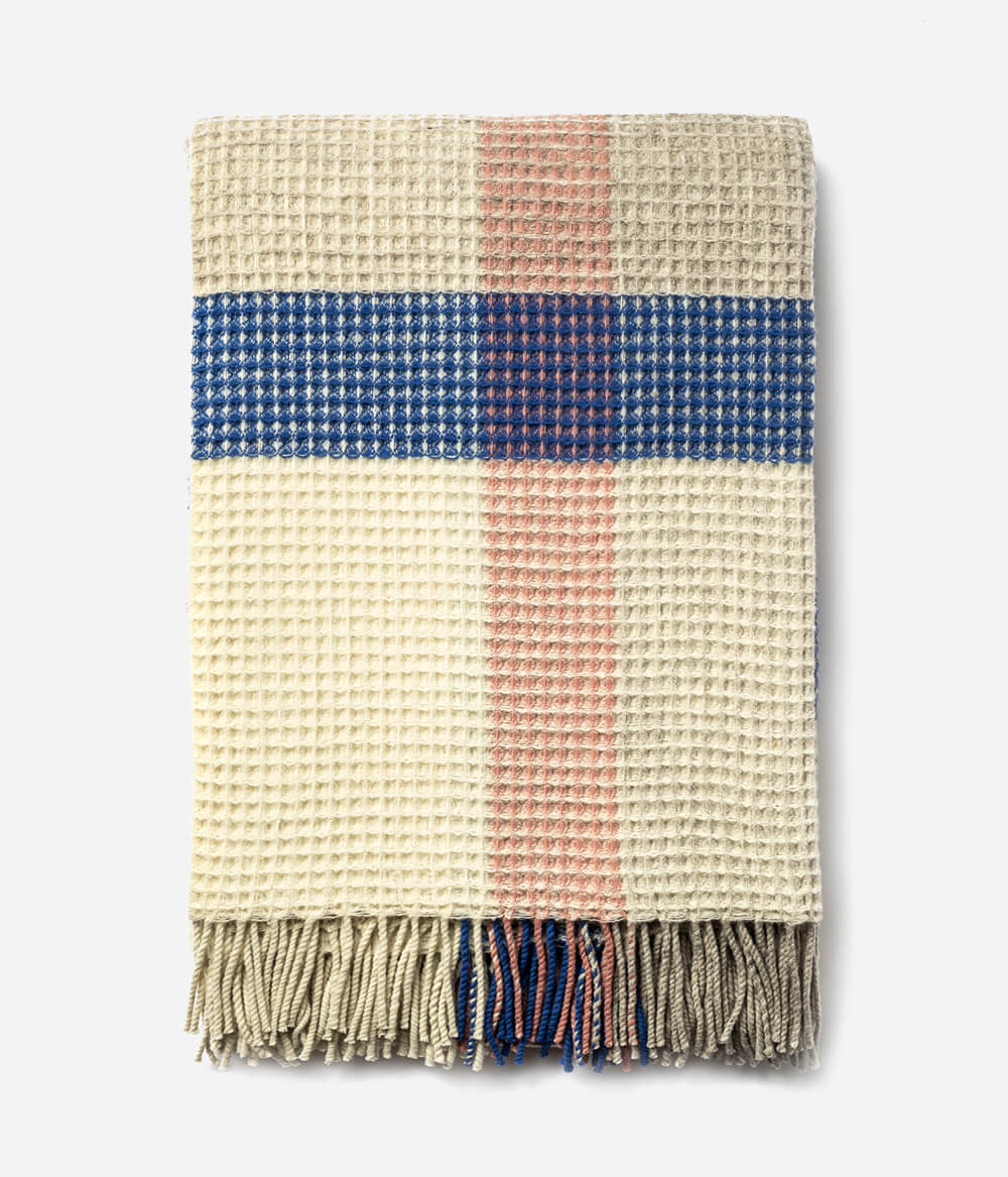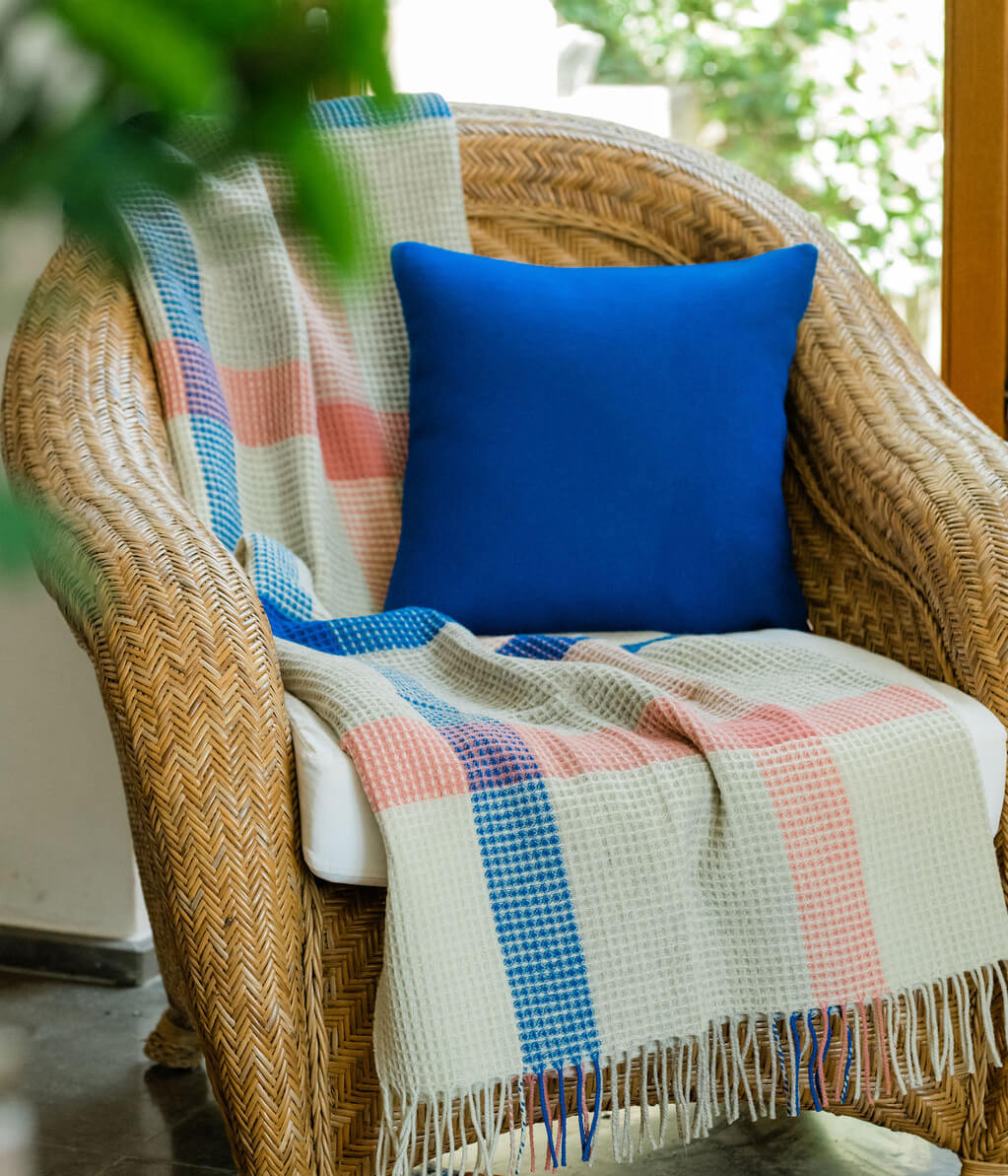 Manta de lã merino, tecida em teares ancestrais. Acabada à mão.