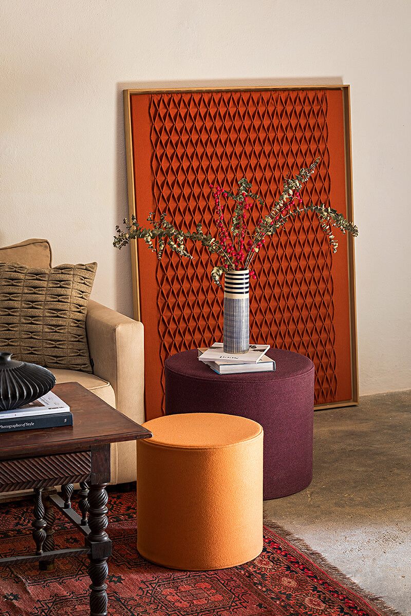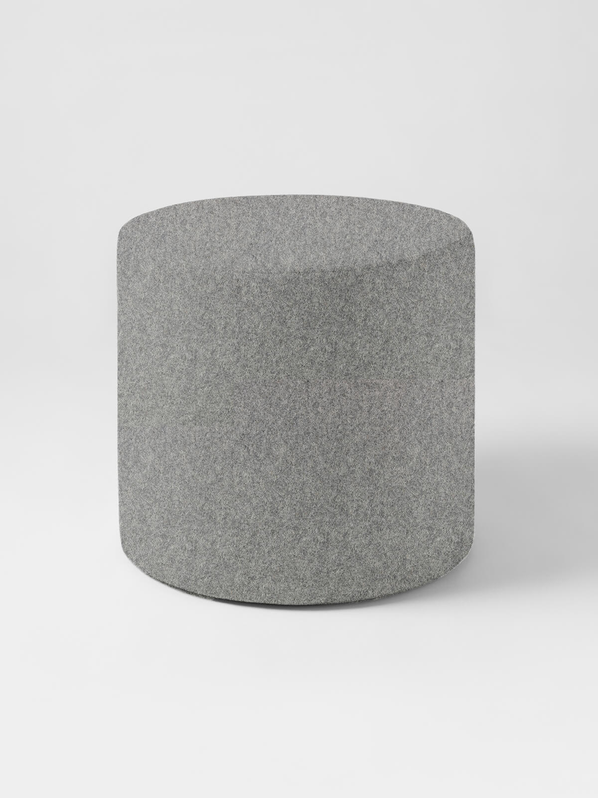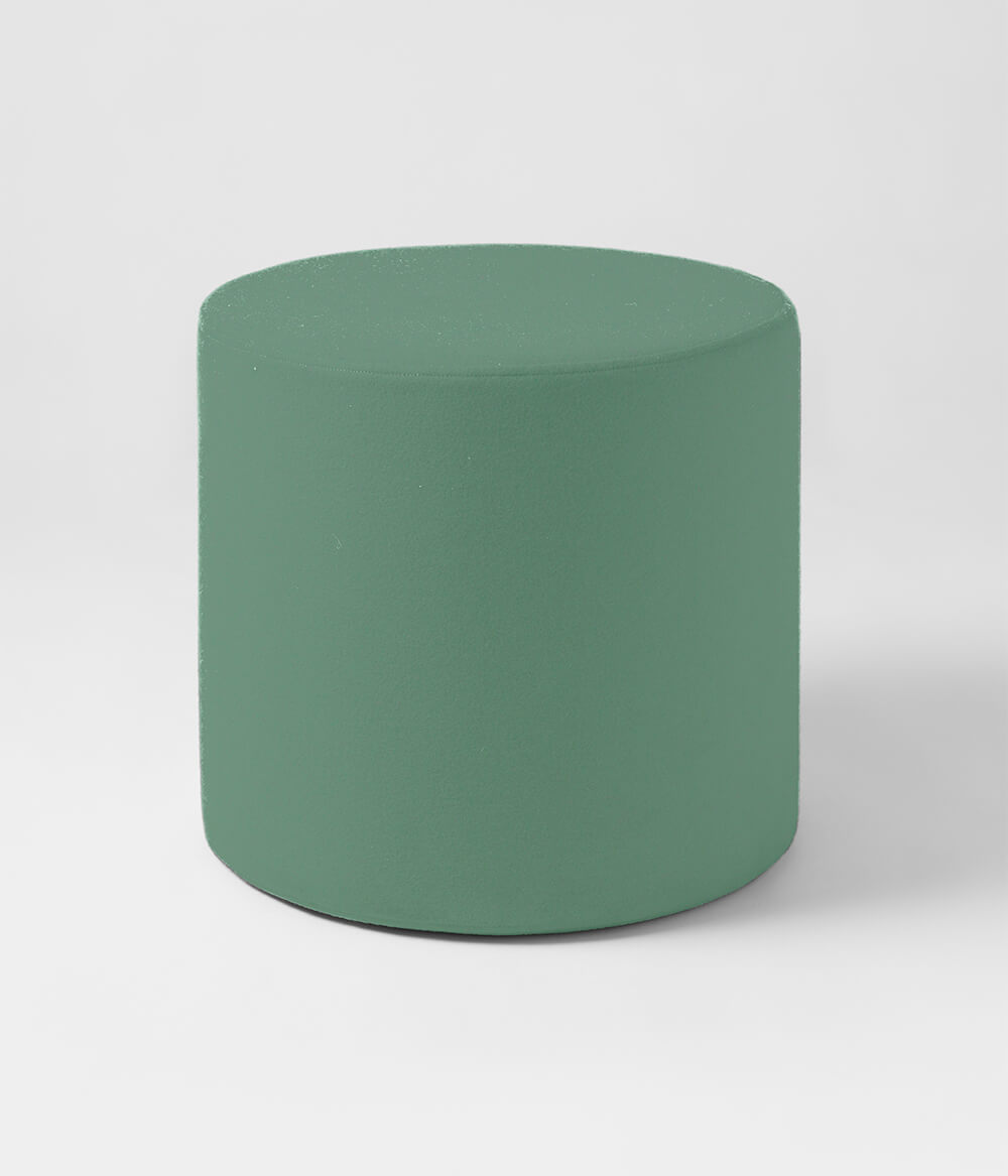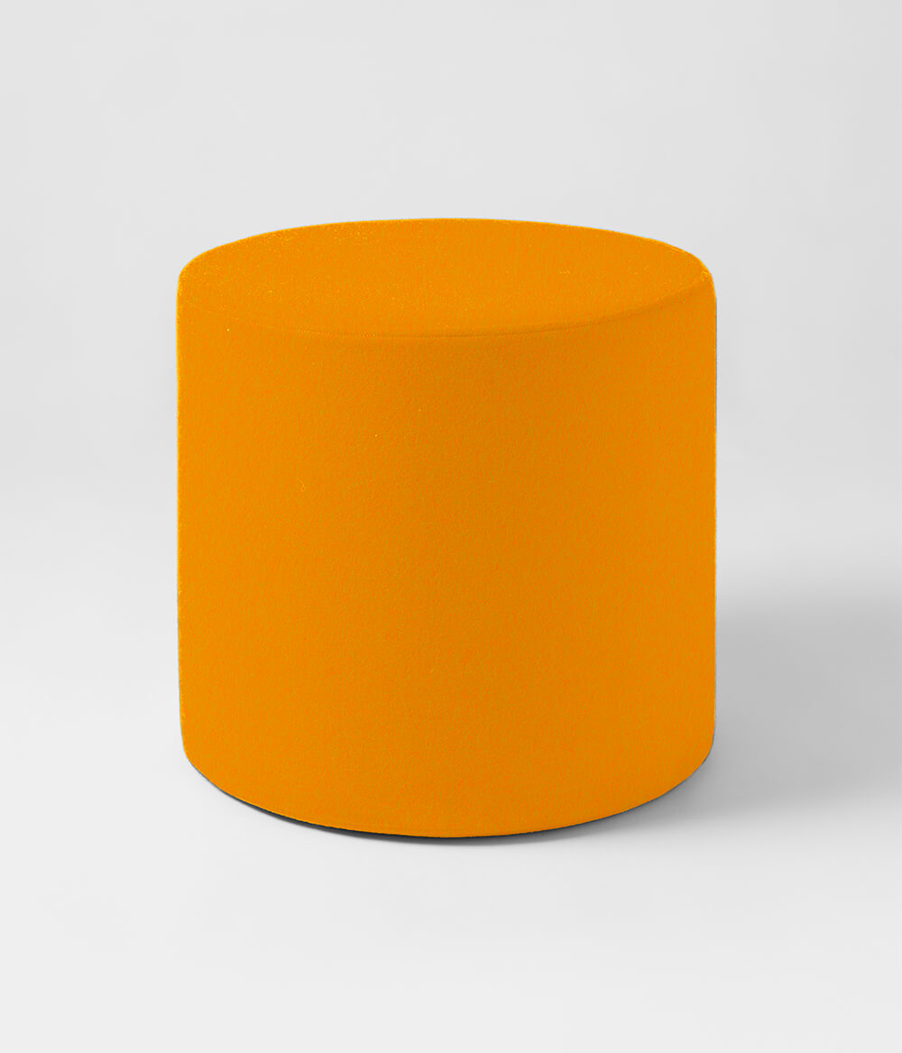 Puff em formato cilíndrico, revestido a burel, e com espuma de alta densidade.