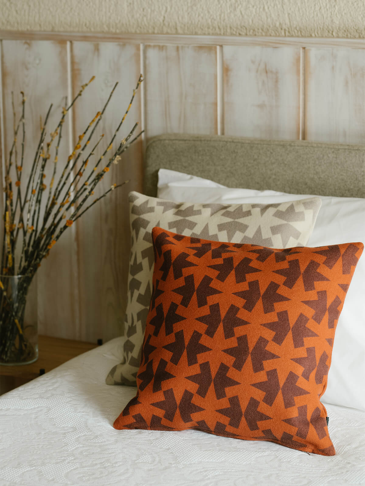 Almofada feita em burel, 100% lã, com impressão digital. Verso em burel liso na cor principal.