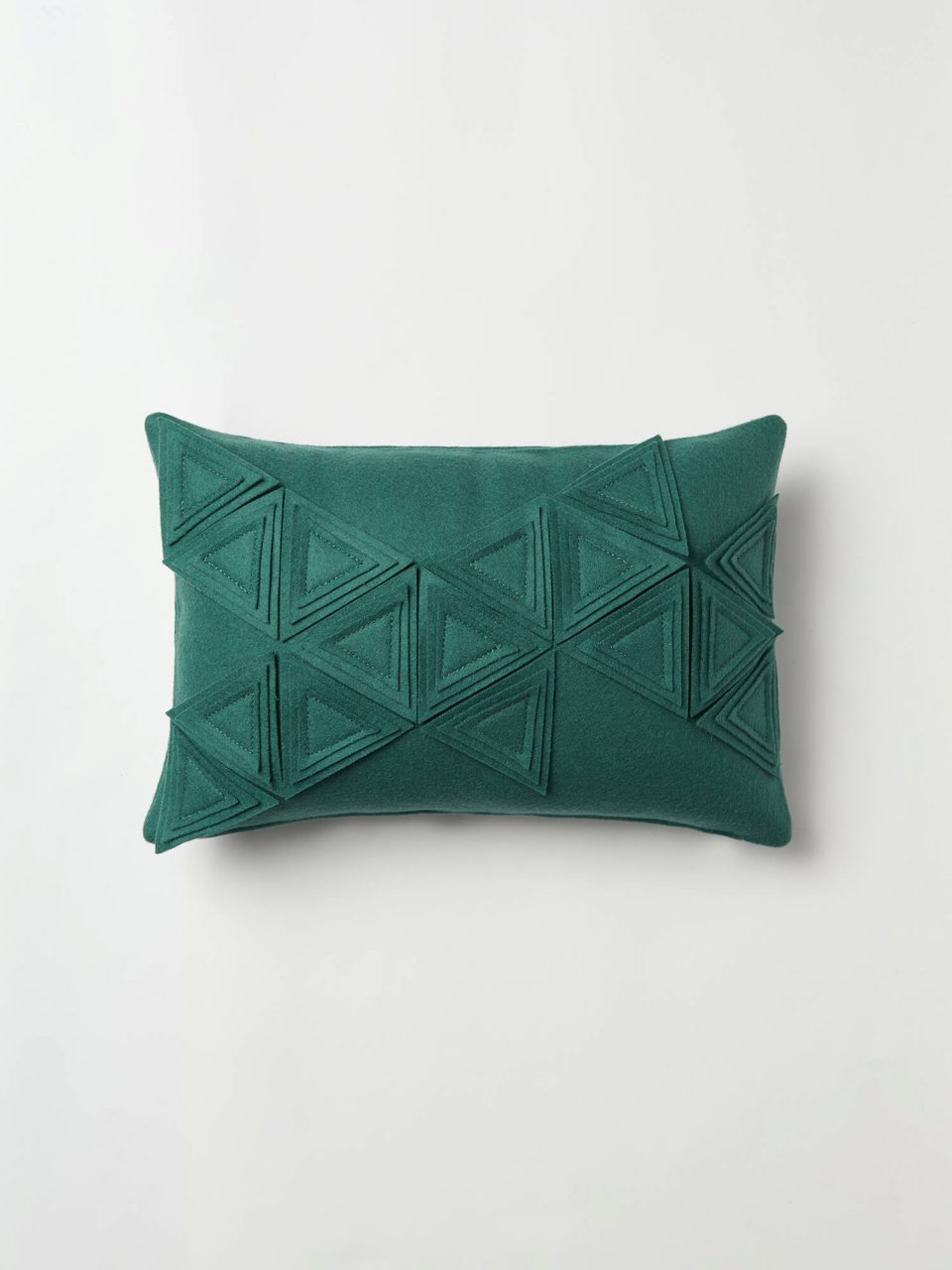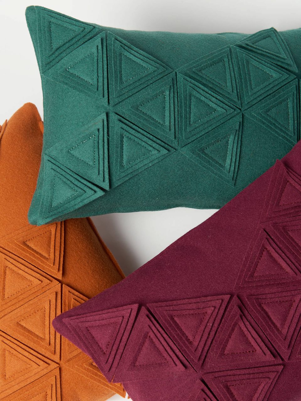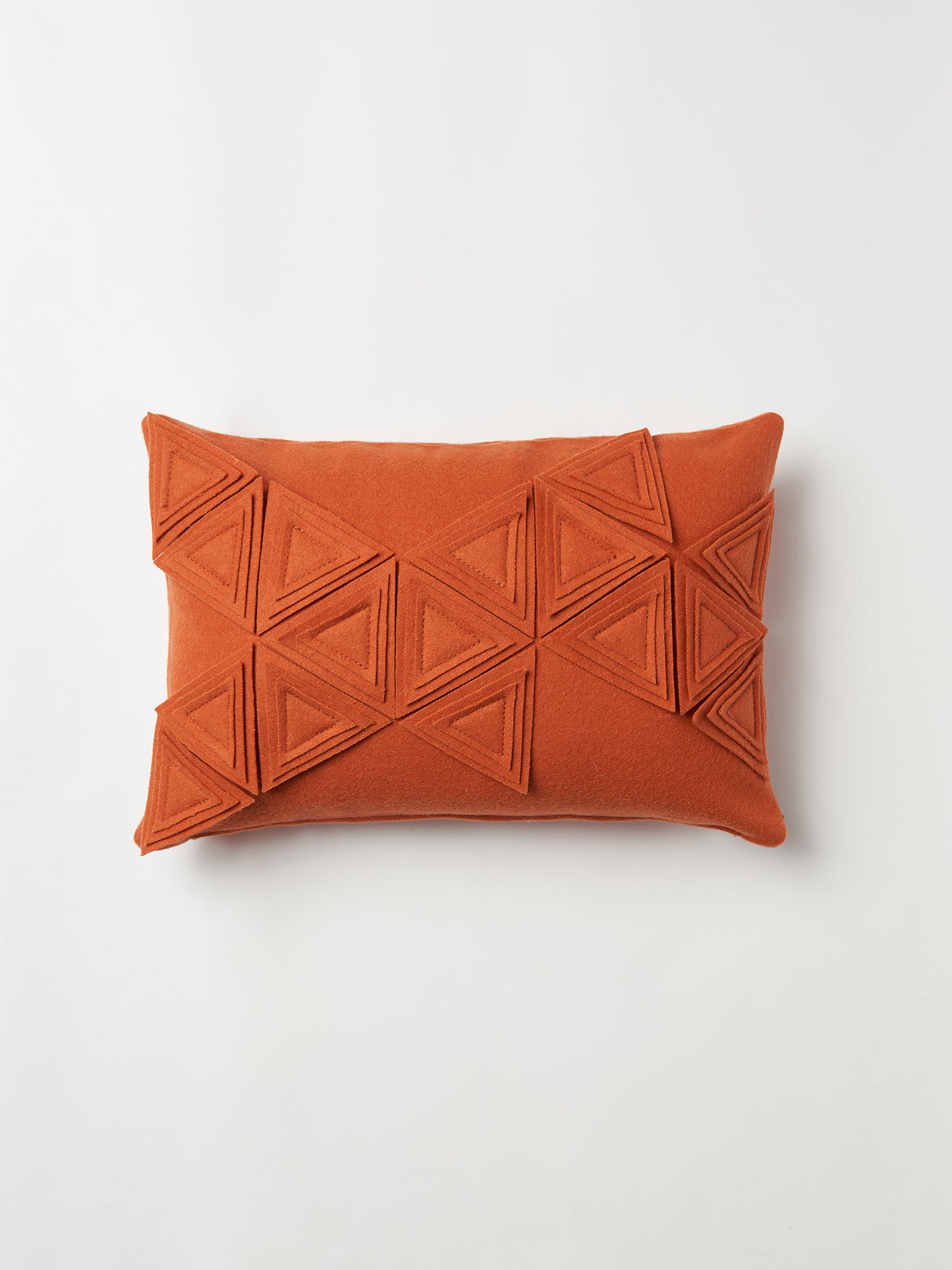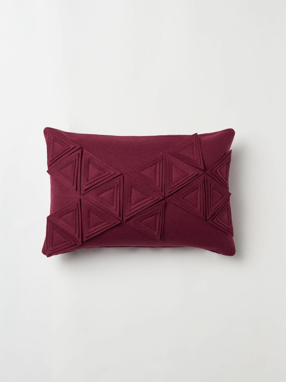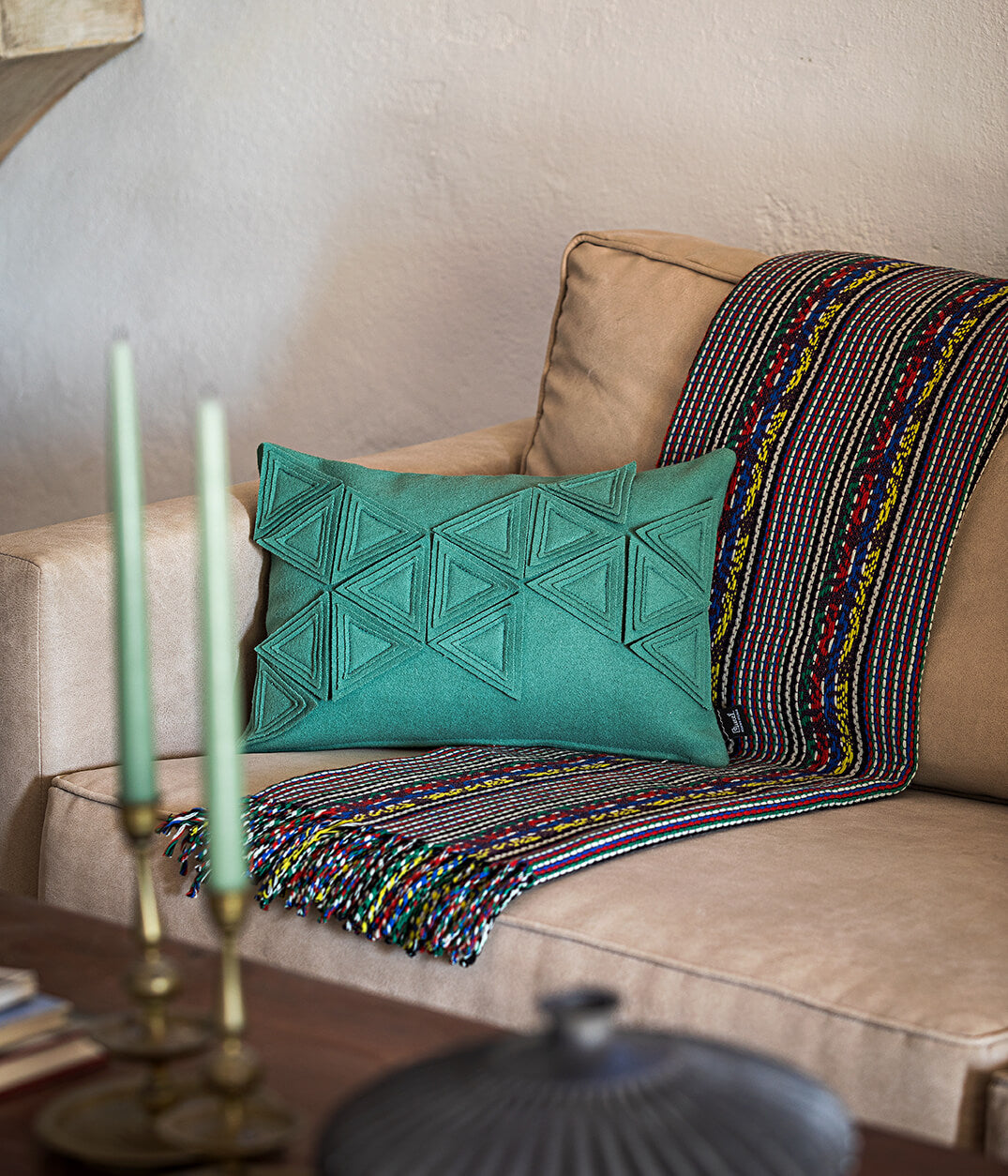 Almofada feita em burel, 100% lã, com o Ponto de Burel Medas costurado à mão. Verso em burel liso na cor principal.