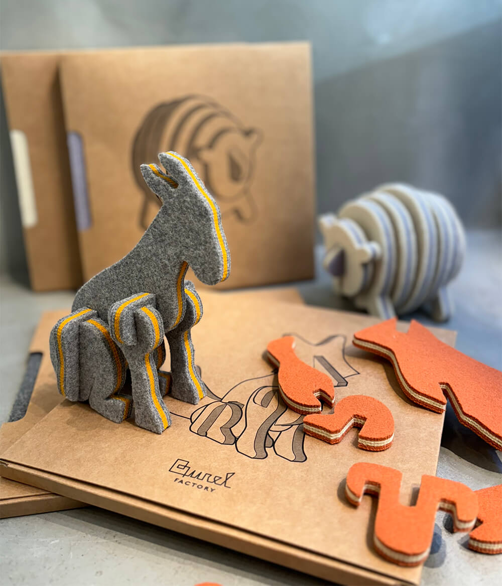 Um objeto divertido, um puzzle 3D construído a partir de peças com várias camadas de burel resultantes de desperdício têxtil, para dar forma a alguns dos animais mais icónicos das montanhas da Serra da Estrela.