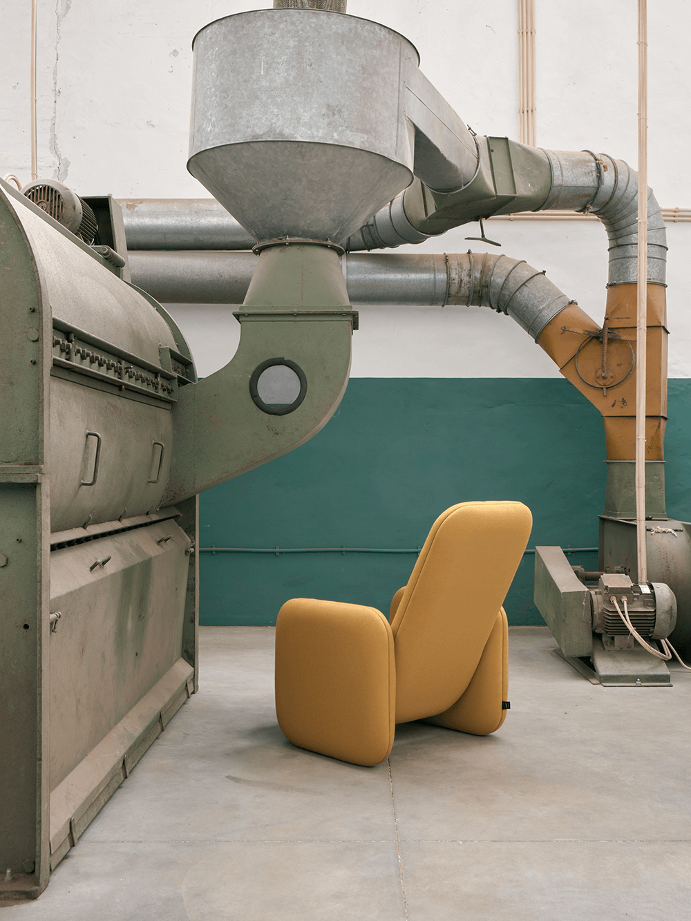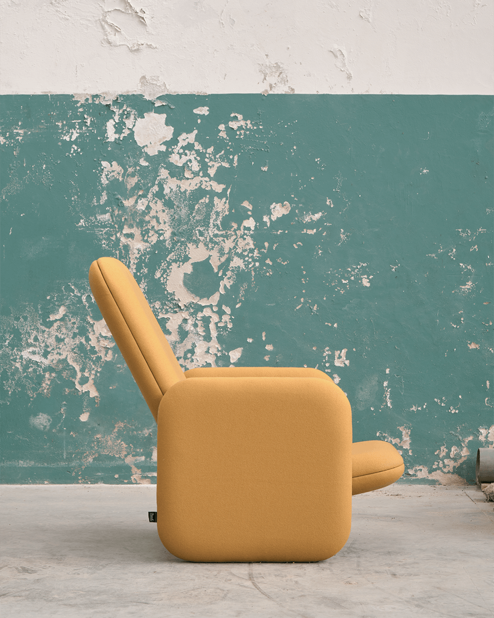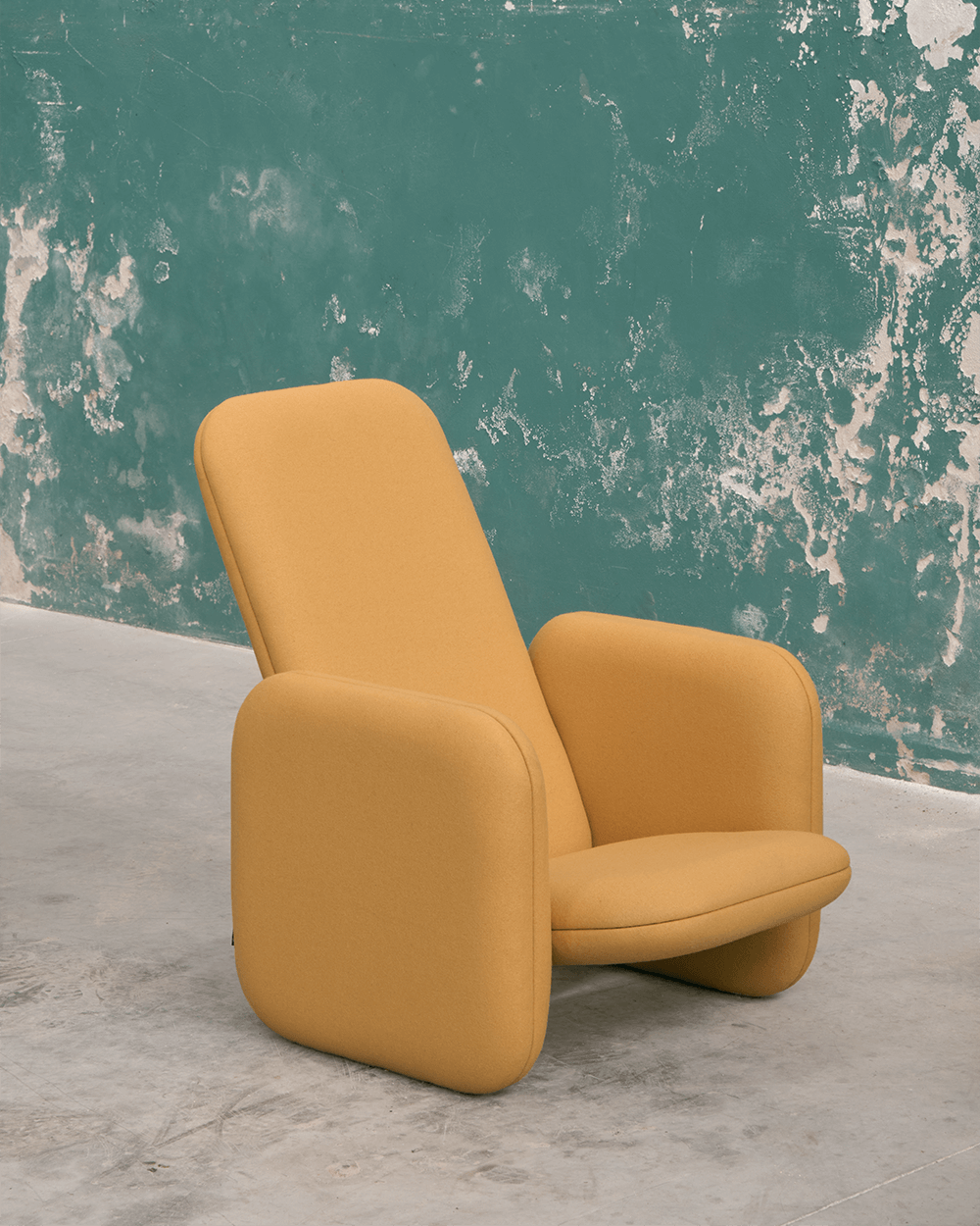 Cadeirão feito em burel, que incorpora a ideia da pluralidade como potenciadora do conforto, transposta agora ao design através de várias almofadas que se unem para dar forma ao objeto.