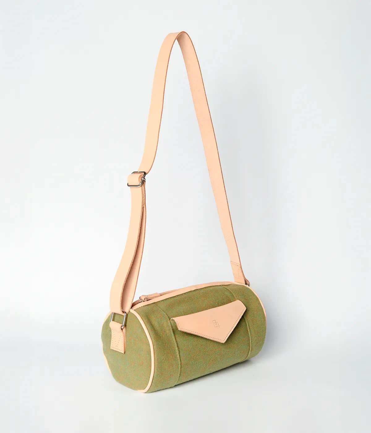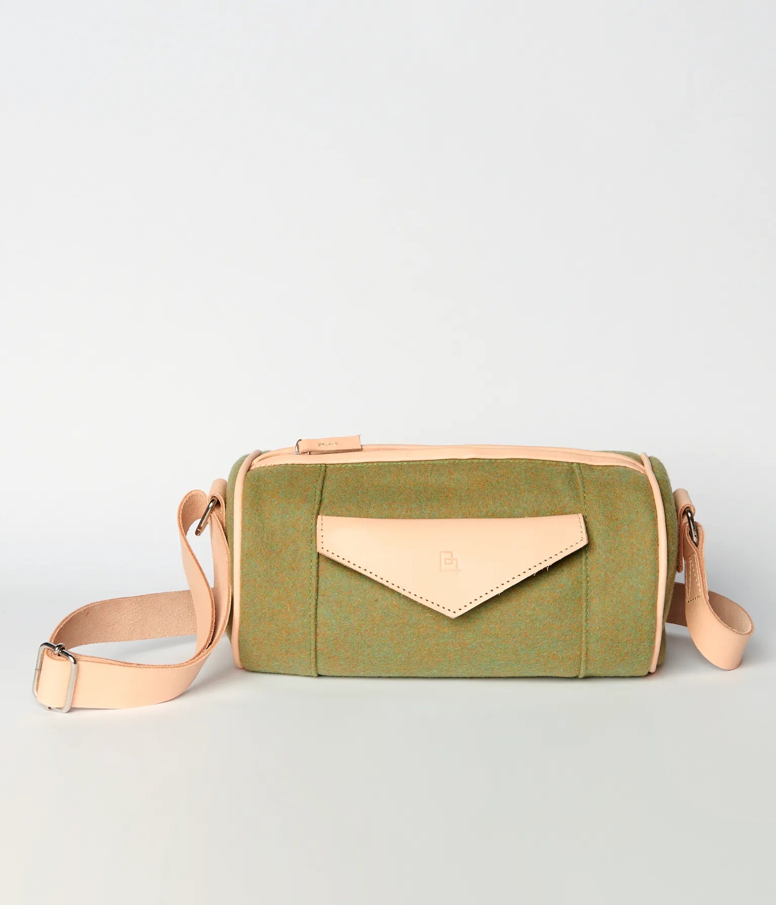 Mala duffle pequena em burel, rebordos e bolso exterior em pele. Forrada, fecha com zíper e possui alça em pele ajustável. Tem um bolso interior com fecho para manter os pequenos essenciais à mão