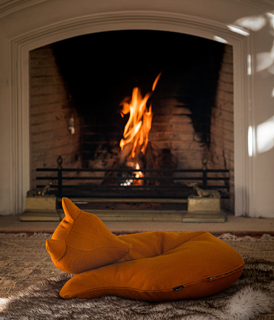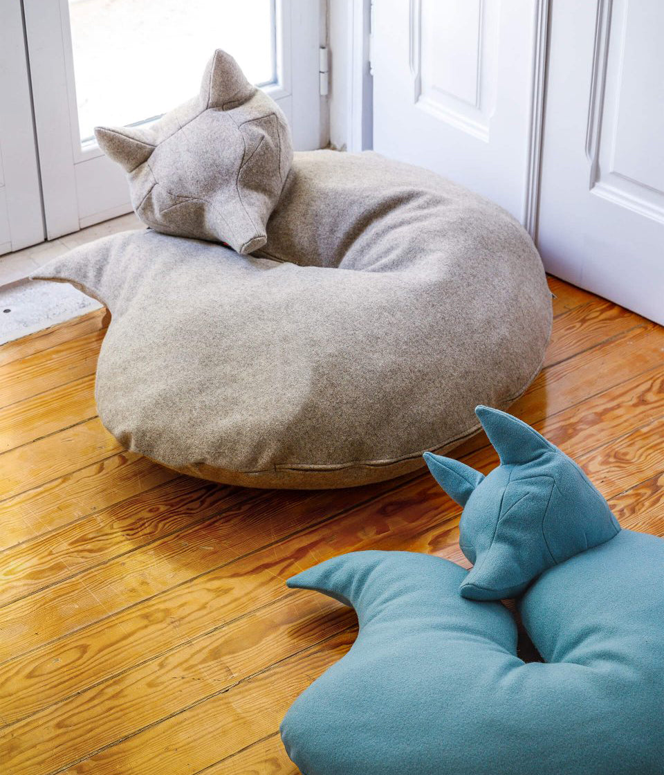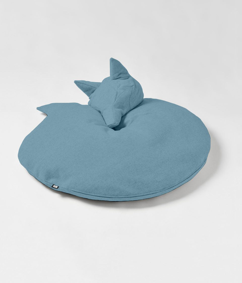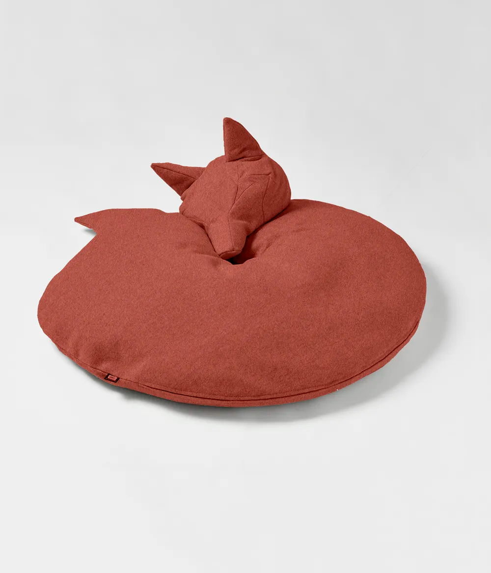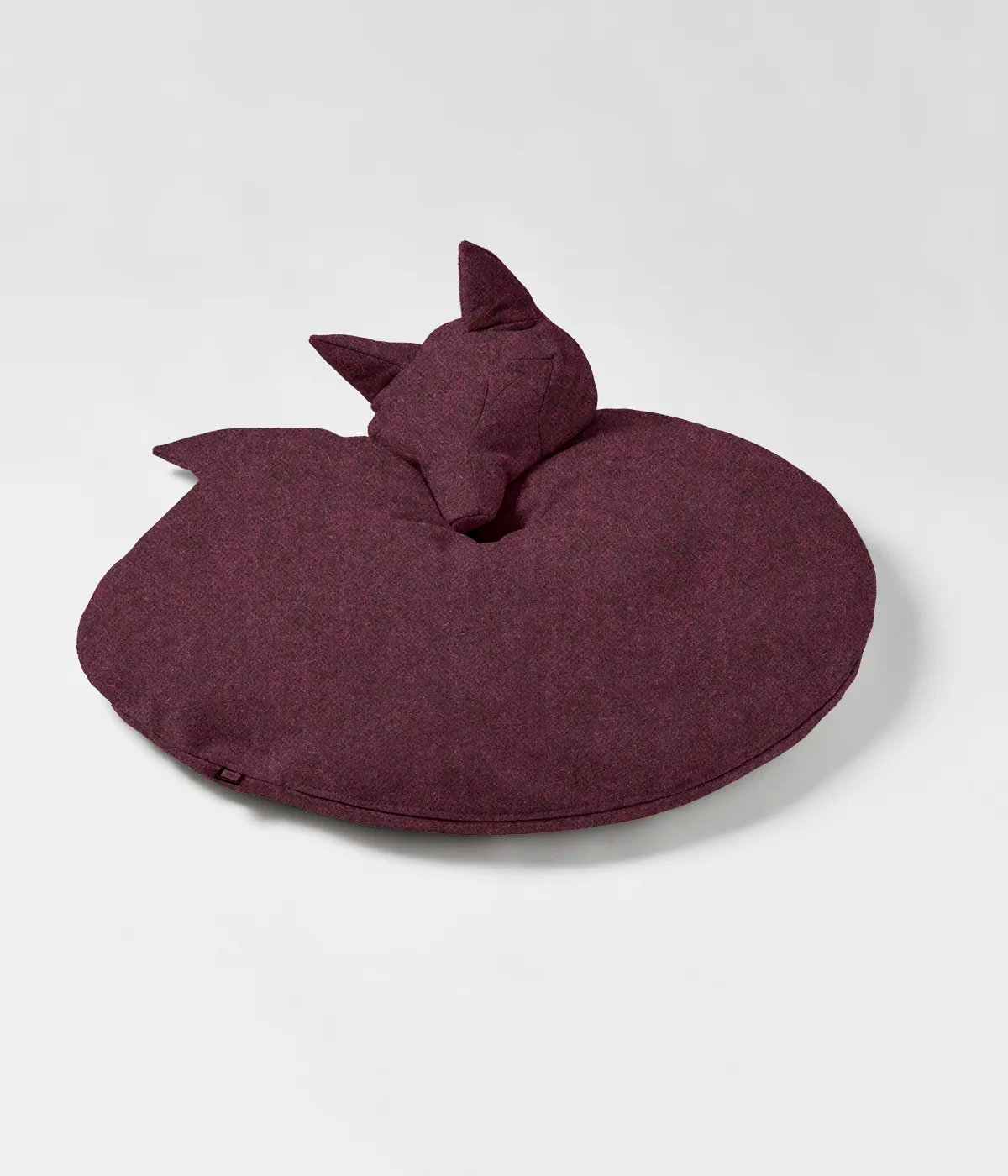 Puff de burel, 100% lã, com a forma de raposa adormecida. Perfeito para casa, o quarto de criança ou para usar cama do animal de estimação.