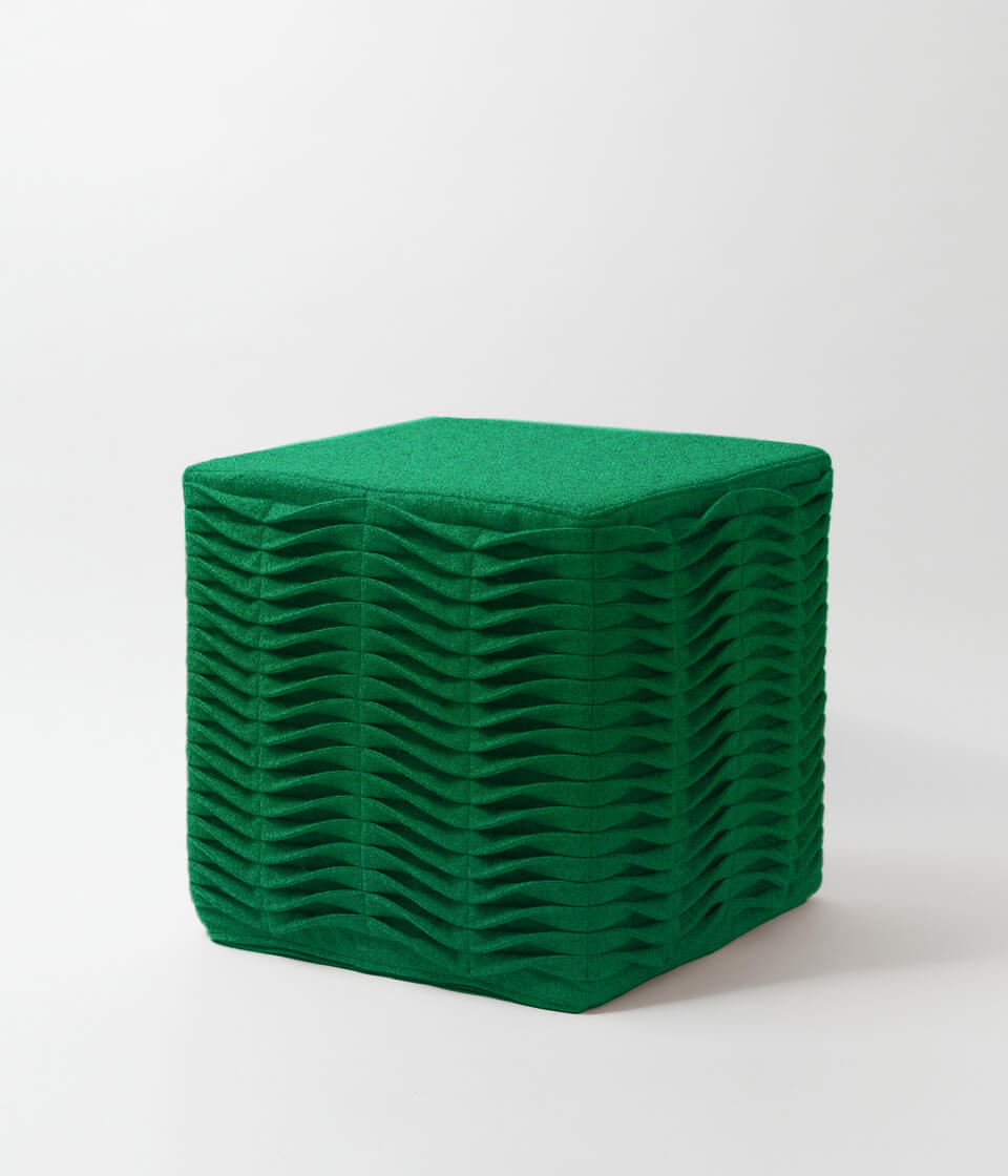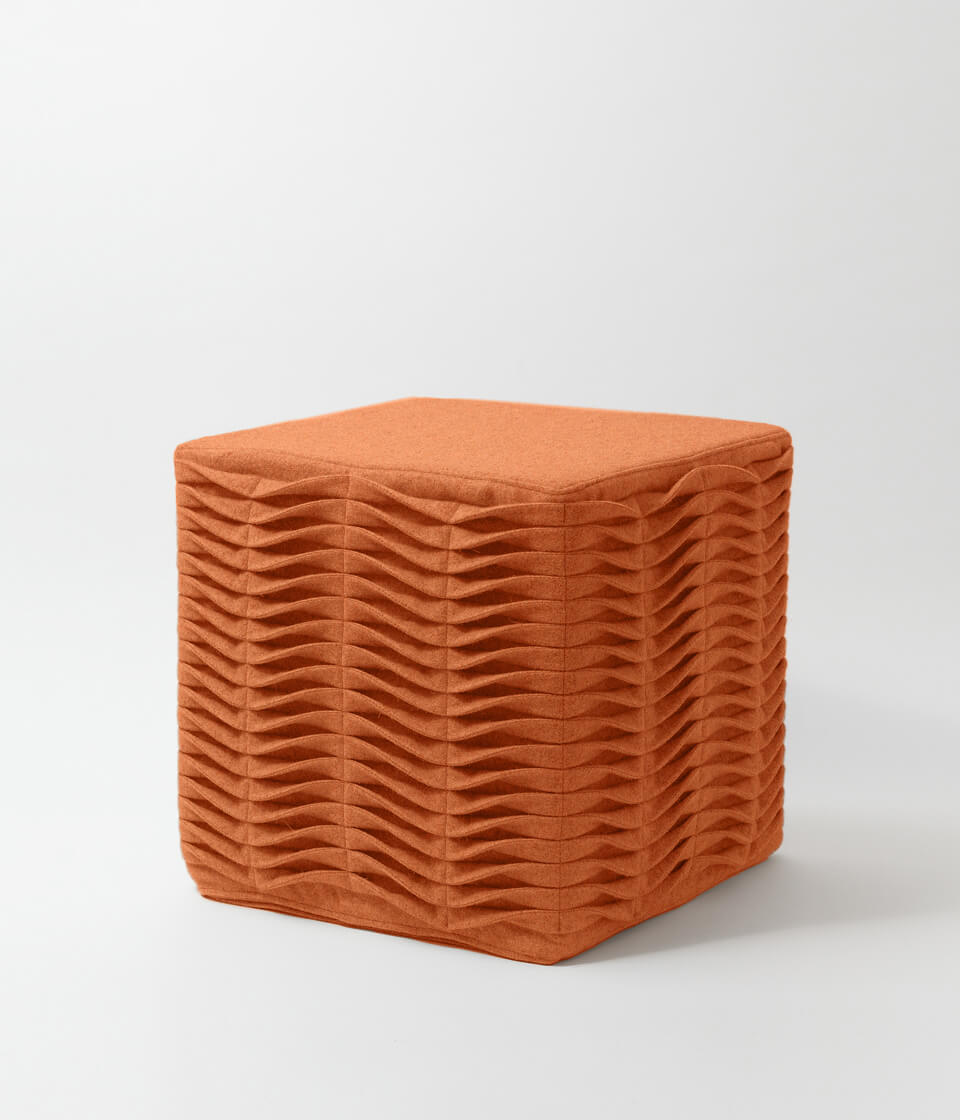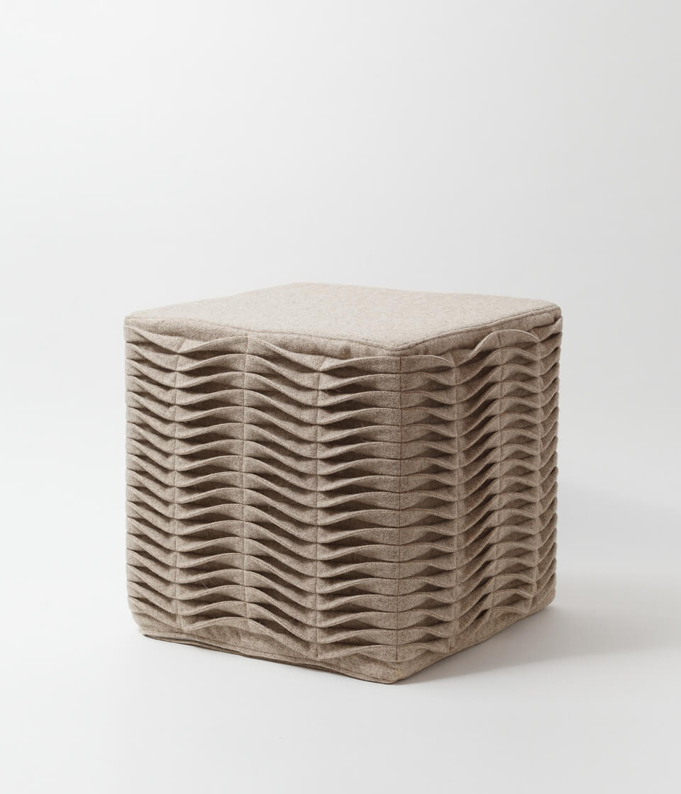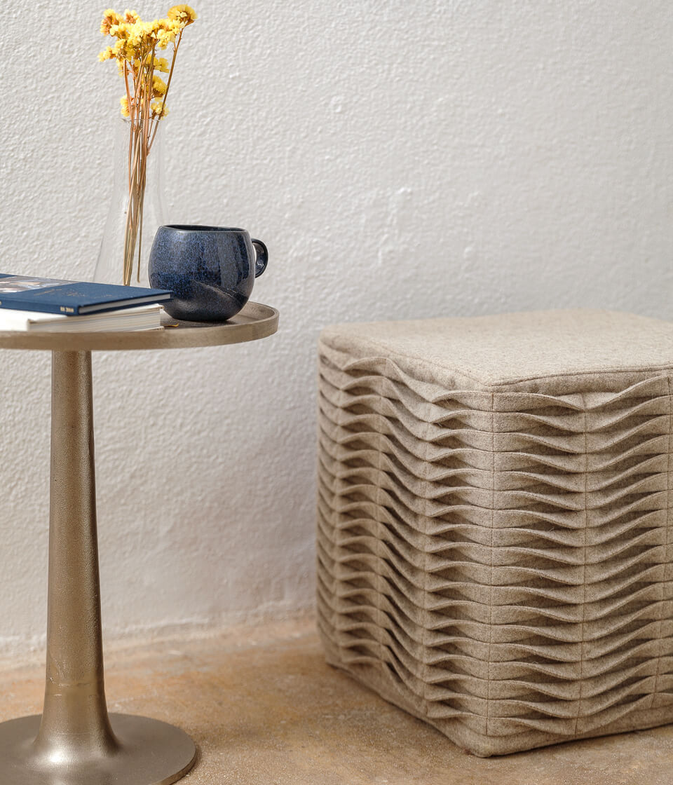 Puff modular com formato de cubo, feito em burel, e Ponto Leivas bordado à mão e espuma de alta densidade.