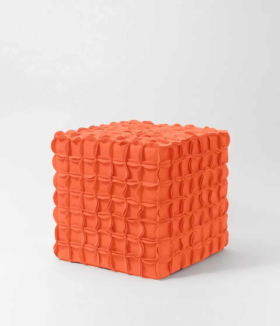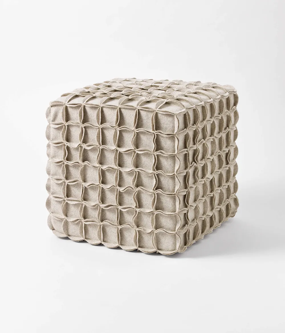 Puff modular com formato de cubo, feito em burel, e Ponto Origami bordado à mão e espuma de alta densidade.