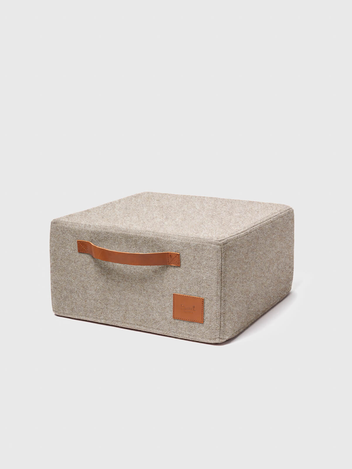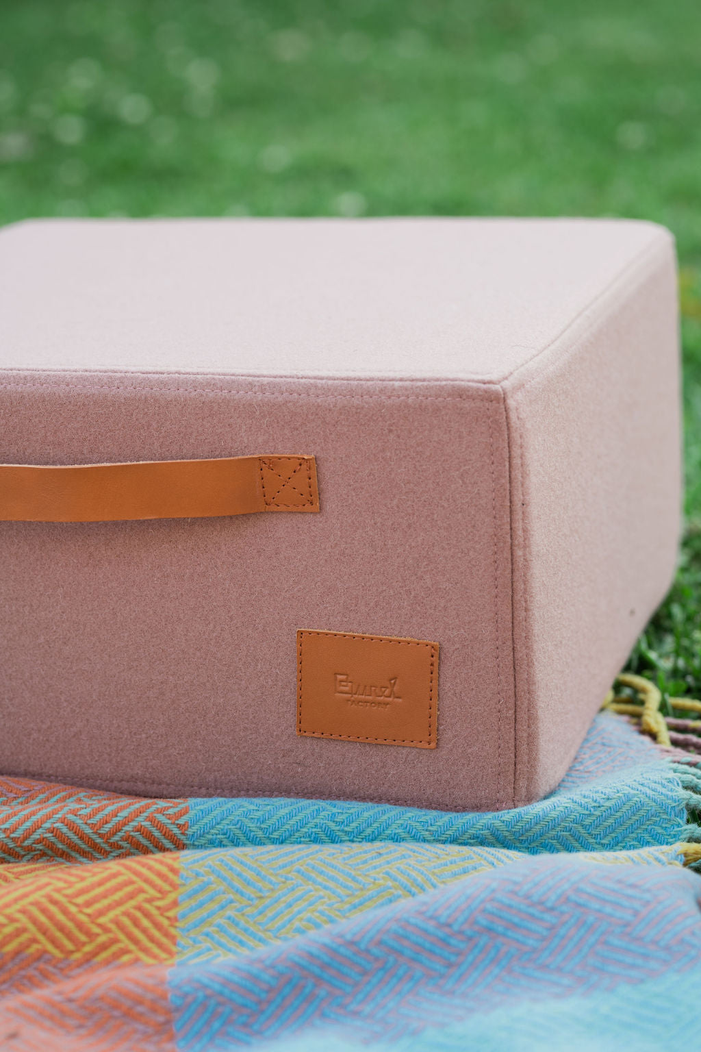 Puff ou repousa-pés feito em burel, 100% lã, e espuma de alta densidade, com alça em pele para levar para todo o lado.