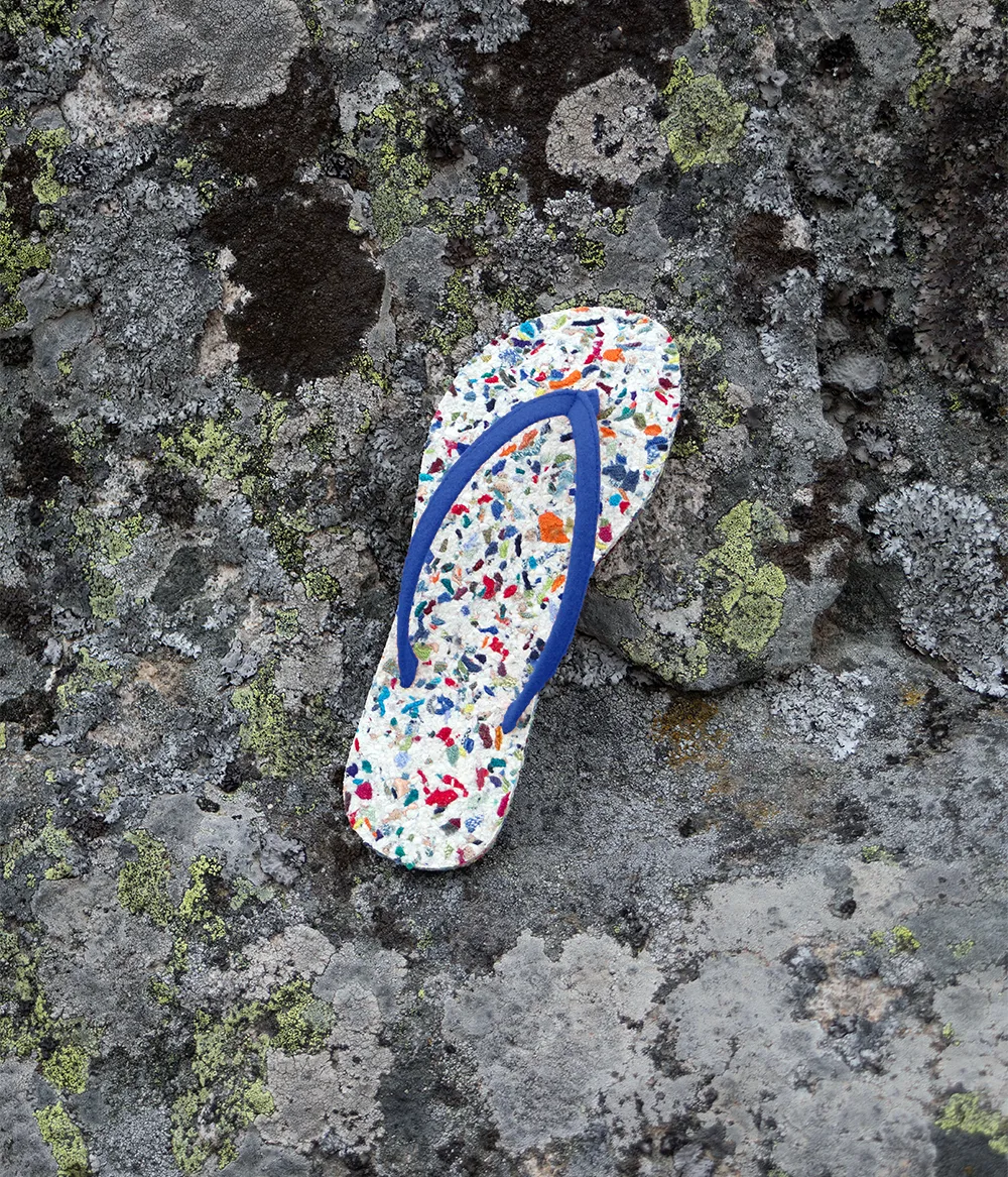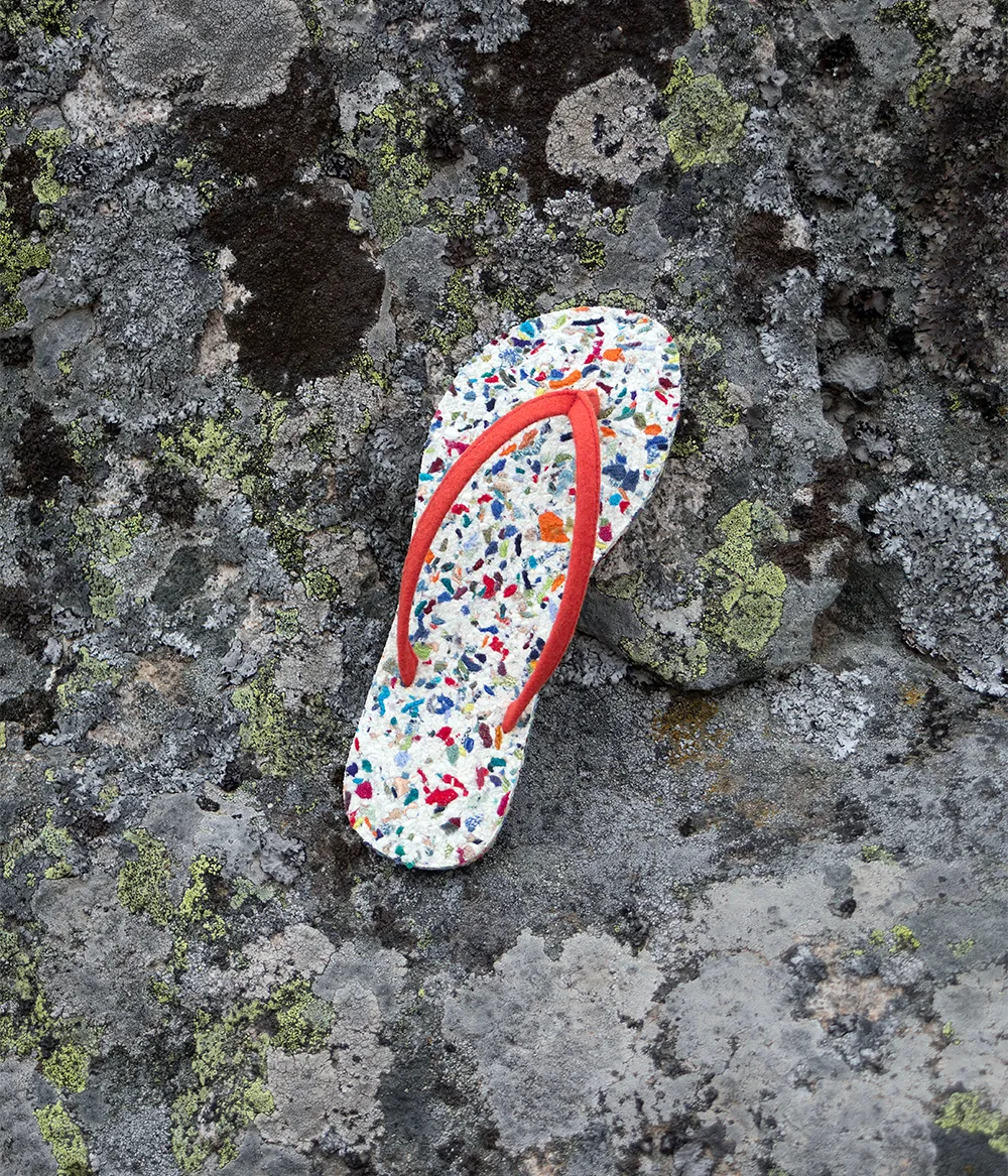 Chinelos feitos a partir do reaproveitamento de desperdício industrial de dois materiais naturais: o burel 100% lã, e a borracha látex.