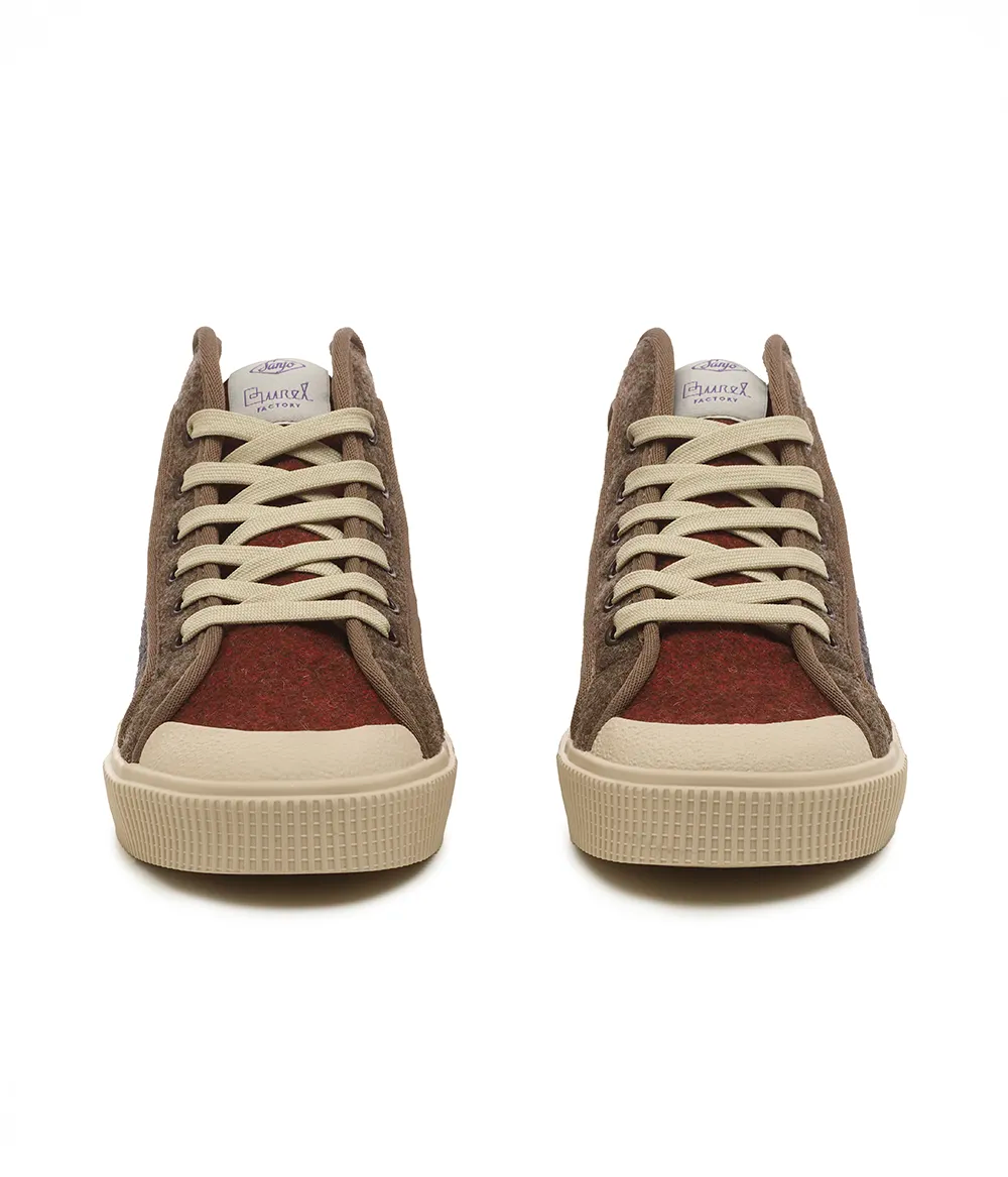 Os icónicos ténis da Sanjo, agora revestidos a burel para maior calor, conforto e resistência à chuva.