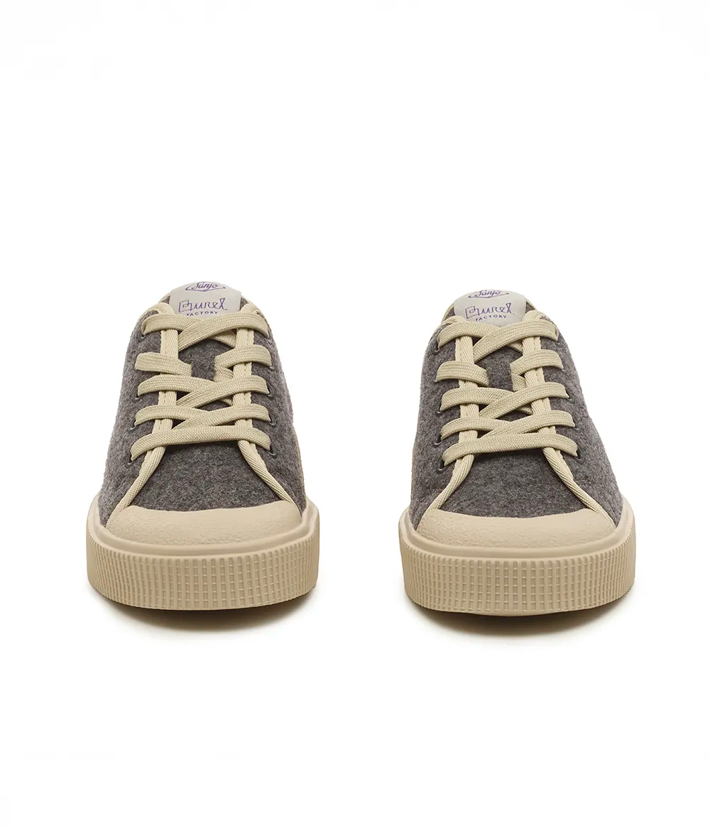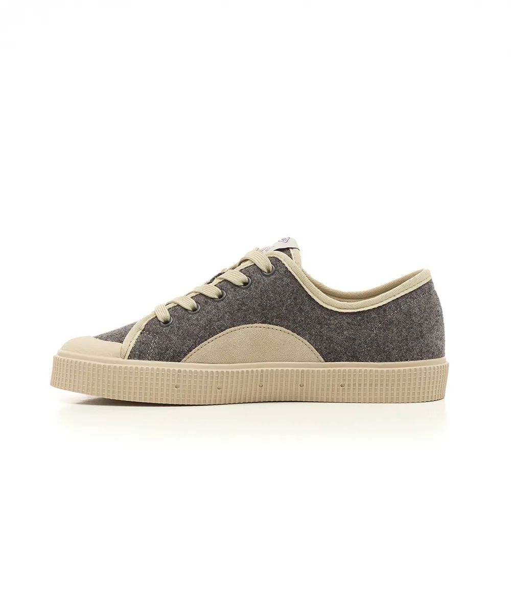 Os icónicos ténis da Sanjo, agora revestidos a burel para maior calor, conforto e resistência à chuva.