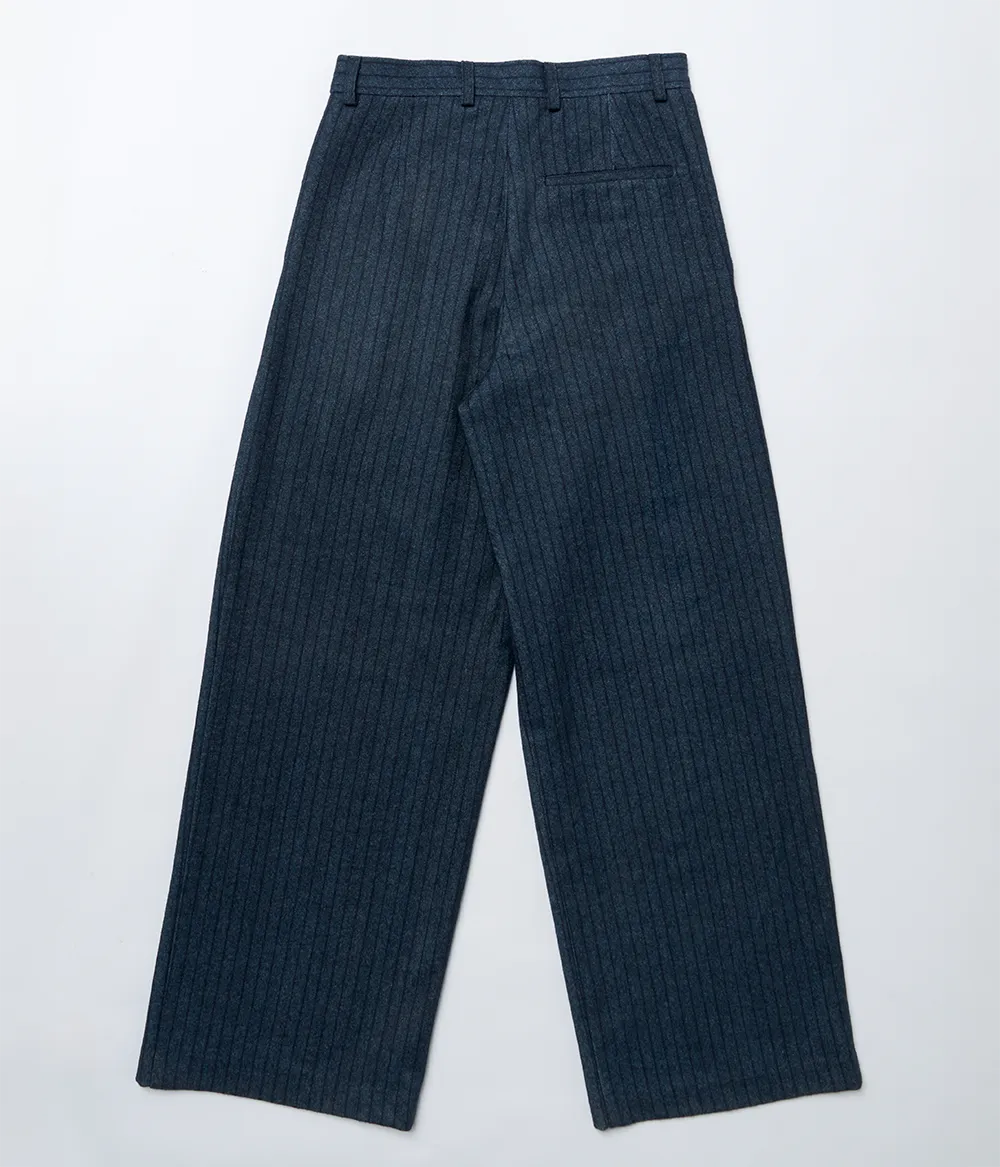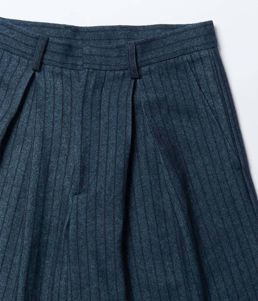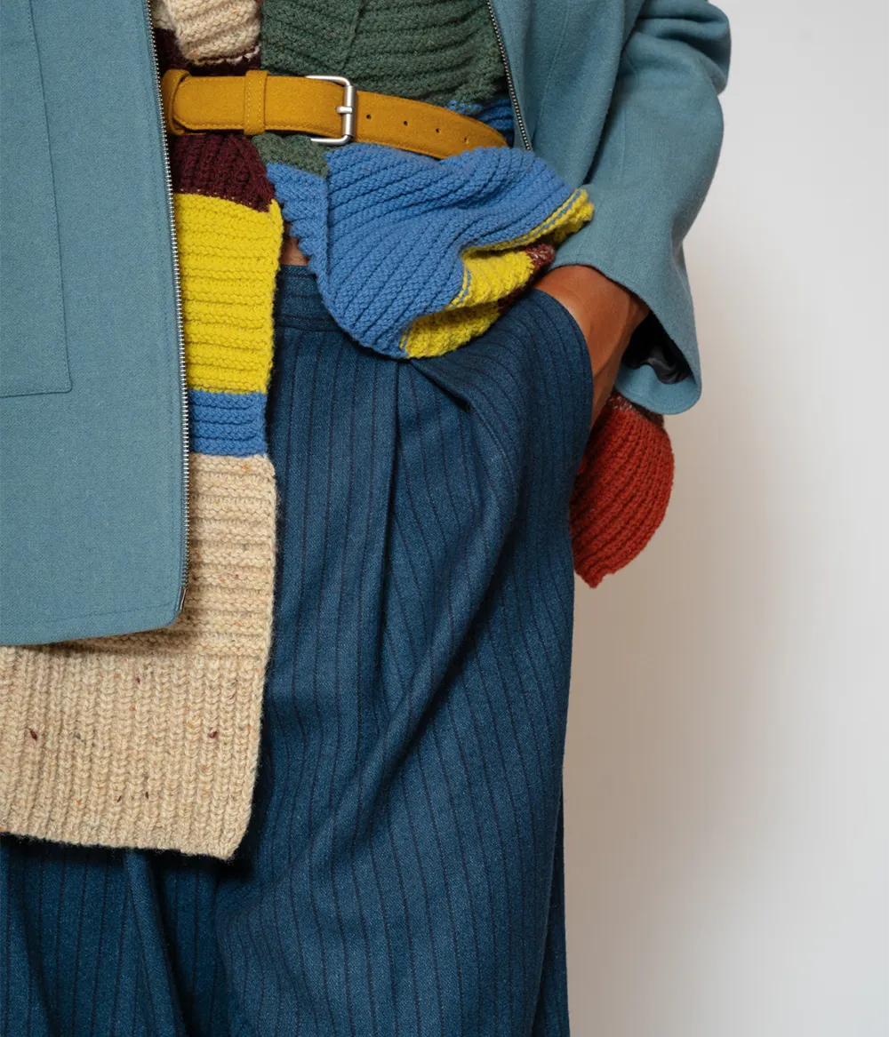 Estas calças estilo culotte reinterpretam a alfaiataria com fluidez e elegância. Compostas por burel, 100% lã, apresentam perna larga e riscas subtis que conferem multiplicidade na sua utilização. Criadas para liberdade de movimento, versatilidade e uso intemporal.