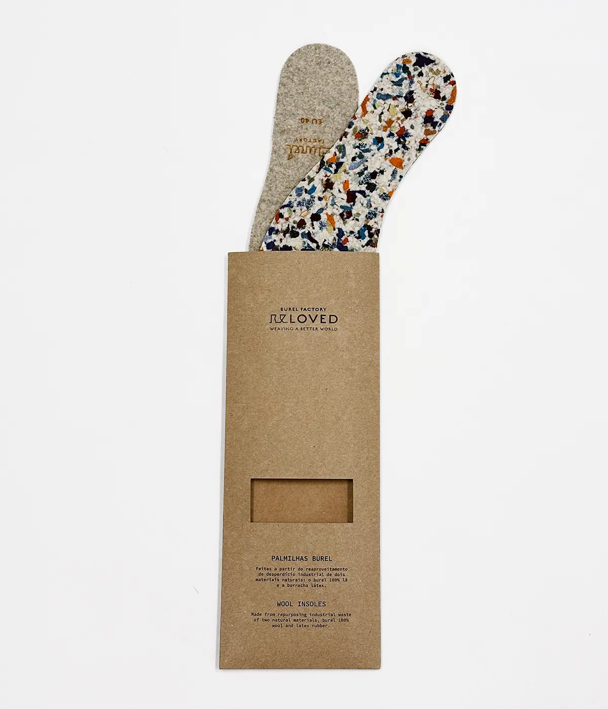Palmilhas em burel e aglomerado - feito a partir do reaproveitamento de desperdício industrial de dois materiais naturais: o burel 100% lã e a borracha látex.