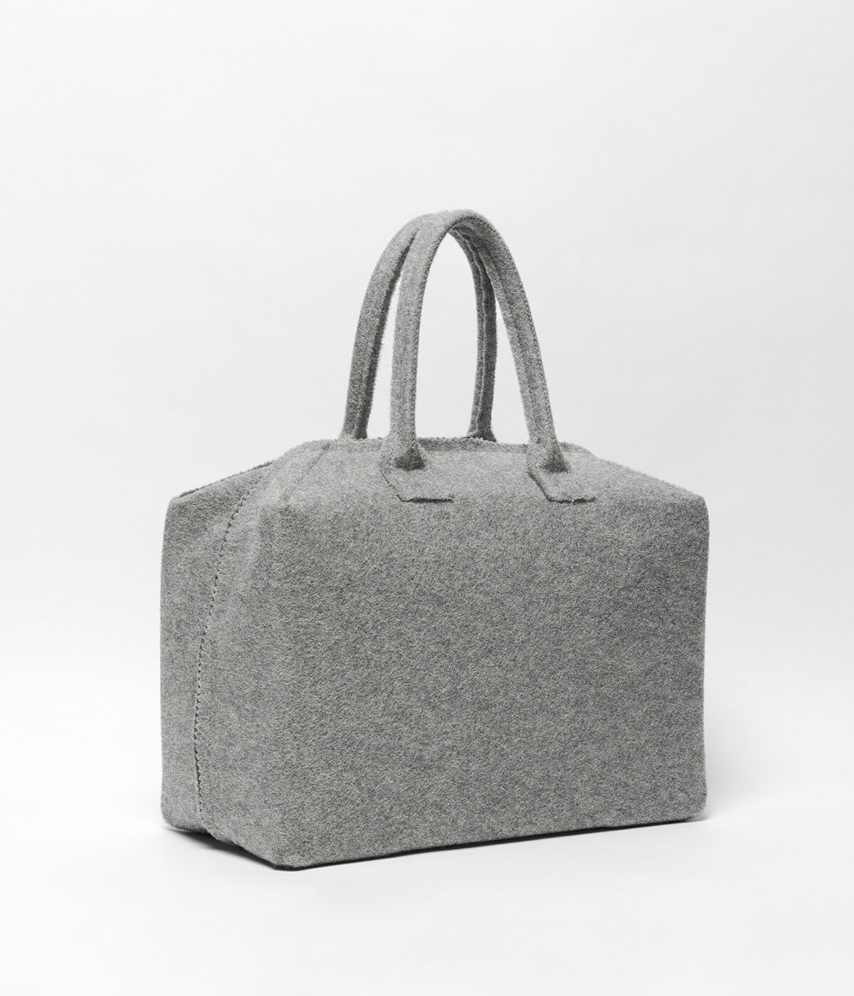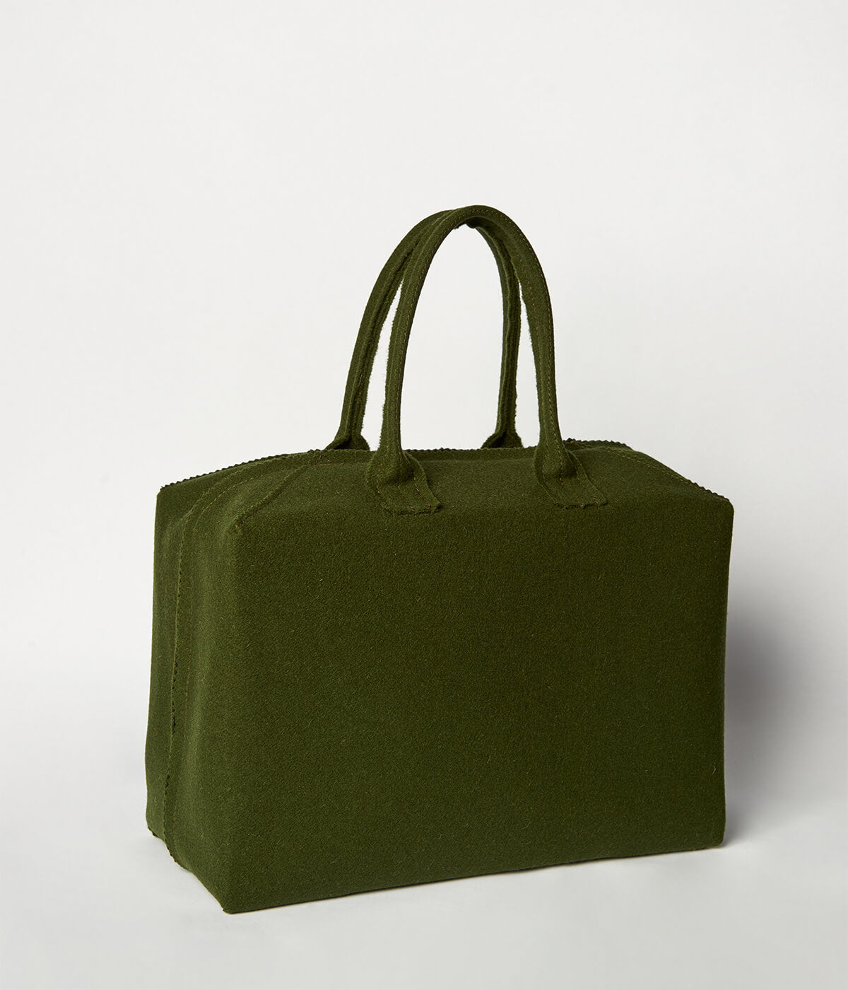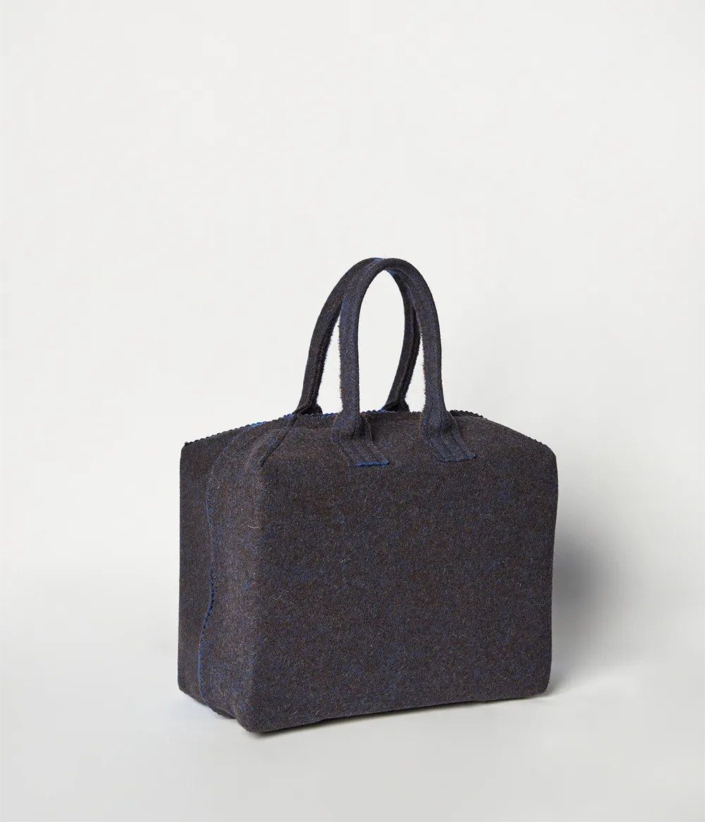 Mala de burel 800gr estruturada e feita à mão a partir de uma só costura e com fecho éclair que permite que seja espalmada para optimizar o espaço.
