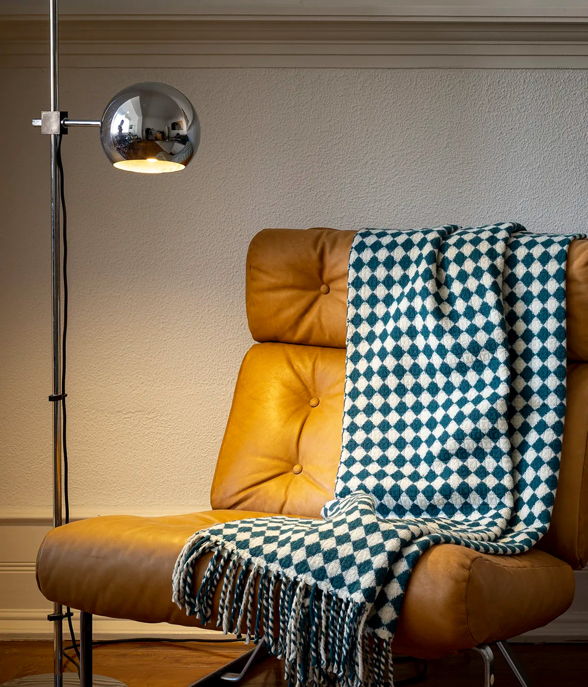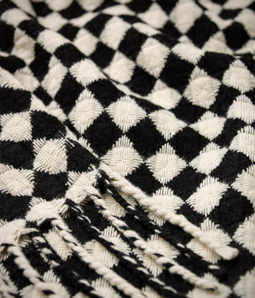 Manta de lã merino Azulejo Burel Factory feita com as melhores fibras de lã merino, em teares ancestrais e acabada à mão. Com um padrão intemporal, tecida nas montanhas da Serra da Estrela.